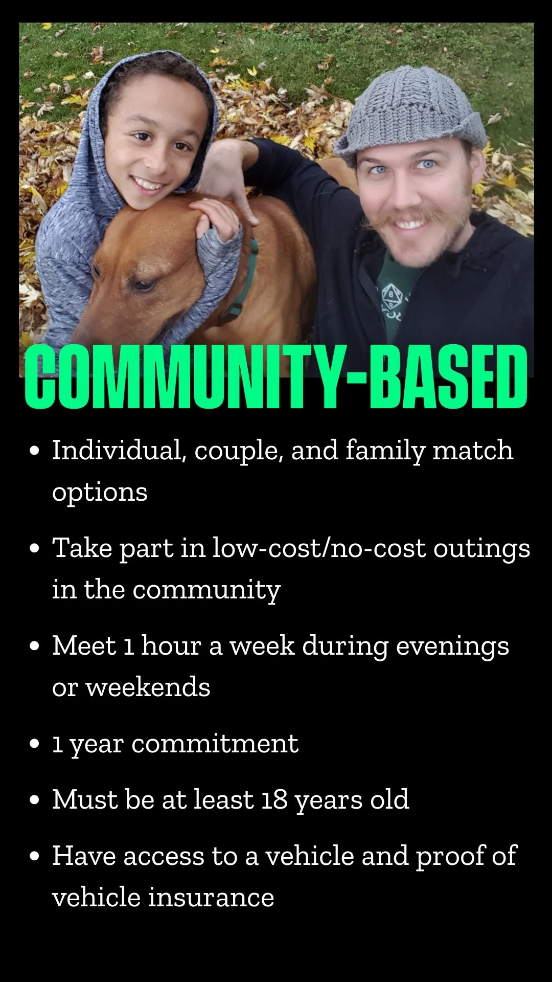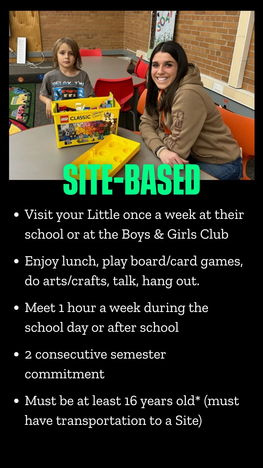 Hang out with your Little just 1 hour a week. Site-Based matches meet during the school day or right after school. Community-Based matches meet during the evenings or on weekends.